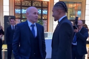 伊涅斯塔來到了在法國舉行的金球獎頒獎典禮,并被拍到與巴薩球員拉菲尼亞在交談。