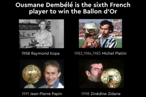 體育資訊9月23日訊 登貝萊獲得2025年金球獎(jiǎng),金球獎(jiǎng)官方曬圖,這名巴黎前鋒成為歷史上第六位獲得這項(xiàng)榮譽(yù)的法國(guó)球員。