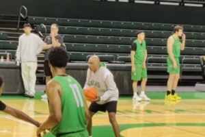 體育資訊9月23日訊 有俄勒岡大學(xué)籃球隊(duì)粉絲發(fā)布了一張球隊(duì)在主場(chǎng)球館訓(xùn)練的照片,從照片中可以看到除了在訓(xùn)練的隊(duì)員之外,場(chǎng)邊還站著穿著便裝的林葳。