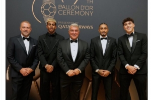 拉波爾塔、弗里克、亞馬爾、拉菲尼亞、庫(kù)巴西出席金球獎(jiǎng)?lì)C獎(jiǎng)典禮,巴薩官方社媒曬出他們的合照,配文:“一個(gè)難忘的夜晚?!?/p>