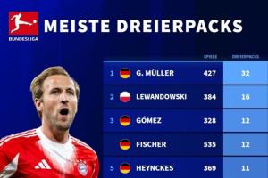 體育資訊09月23日訊 德轉(zhuǎn)統(tǒng)計了德甲歷史帽子戲法榜,蓋德穆勒32次帽子戲法斷層領(lǐng)先,凱恩僅用67場就排在歷史第7。