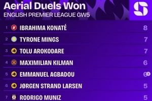 體育資訊9月24日訊 英超第5輪戰(zhàn)罷,squawkafootball列各項(xiàng)數(shù)據(jù)排行,利物浦中衛(wèi)科納特是本輪贏得爭(zhēng)頂最多的球員,共計(jì)8次。