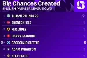體育資訊9月24日訊 英超第5輪戰(zhàn)罷,squawkafootball列各項數(shù)據(jù)排行,賴因德斯共創(chuàng)造2次重大機會,本輪最多。