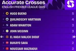 體育資訊9月24日訊 英超第5輪戰(zhàn)罷,squawkafootball列各項(xiàng)數(shù)據(jù)排行,狼隊(duì)后衛(wèi)烏戈-布埃諾是精準(zhǔn)傳中次數(shù)最多的球員,共5次。