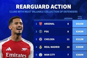 體育資訊9月24日訊 德國轉(zhuǎn)會市場統(tǒng)計了各隊陣容中后衛(wèi)球員的總身價,并列出榜單,阿森納4.15億歐居首,巴黎、切爾西二三位。