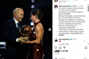 體育資訊9月25日訊 巴薩傳奇伊涅斯塔出席金球典禮為女足金球獎(jiǎng)?lì)C獎(jiǎng),今日他更新社媒為所有獲獎(jiǎng)?wù)吆吞崦咚蜕献YR。