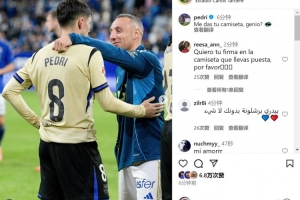 巴薩中場佩德里更新社媒動態(tài),曬出與皇家奧維耶多40歲中場卡索拉的賽后合照,對其表達敬意,配文:“天才,能把你的球衣給我嗎?”