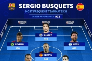 體育資訊9月26日訊 西班牙中場布斯克茨今日宣布賽季結(jié)束后退役,德轉(zhuǎn)評出在布斯克茨截止目前的職業(yè)生涯中,最常搭檔的11人陣容。其中梅西639場居首,皮克605場第二。布斯克斯本人目前職業(yè)生涯出場次數(shù)972場。