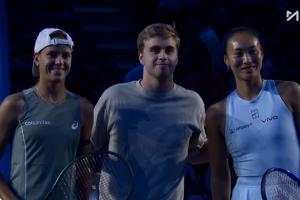 體育資訊09月27日訊 今晚中網(wǎng)第二輪,鄭欽文迎復(fù)出首戰(zhàn),瑞典乒乓球球員莫雷加德賽前為選手挑邊,隨后三人合影。