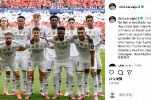 本場比賽受傷的卡瓦哈爾也在社媒曬出全隊合影鼓勵球隊,配文寫道:“這不是我們想要的結果。我們需要改進的地方還有很多,我們首先要進行自我反省。接下來的路就是繼續(xù)努力,從錯誤中學習,并以更強的姿態(tài)重新站起來。賽季還很漫長,還有很多目標需要實現(xiàn)。Hala Madrid! ”