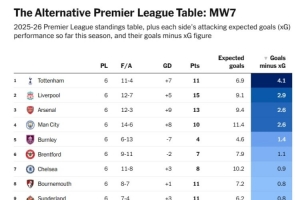 體育資訊10月2日訊 根據(jù)The Athletic統(tǒng)計,曼聯(lián)預期進球12.3個,實際進球7個,是英超實際進球與預期進球相差最大的球隊。