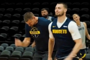 視頻當(dāng)中,約基奇和布勞恩賽跑,約基奇步履踉蹌,布勞恩率先到達(dá)終點(diǎn)后比出獲勝手勢(shì)。