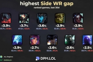 體育資訊10月4日訊 外網(wǎng)數(shù)據(jù)統(tǒng)計(jì)媒體DPM.LOL分享了紅藍(lán)方勝率差距最大英雄榜單,具體如下:
