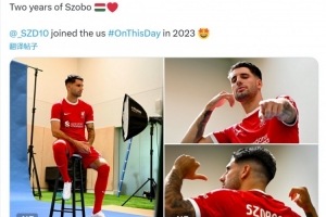 利物浦官方社媒曬出索博斯洛伊加盟球隊(duì)時(shí)的照片,配文:“2023年的今天索博斯洛伊加入我們?!?/p>