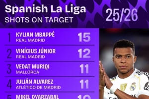 體育資訊10月7日訊 日前,Squawka統(tǒng)計了本賽季西甲射正次數(shù)排行,姆巴佩15次居首。