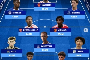 中場(chǎng):沃頓(水晶宮,4500萬(wàn)歐)、劉易斯-斯凱利(阿森納,4500萬(wàn)歐)、梅努(曼聯(lián),5000萬(wàn)歐)