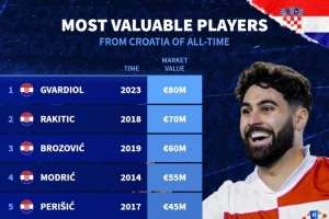 體育資訊10月13日訊 德國轉(zhuǎn)會(huì)市場(chǎng)統(tǒng)計(jì)了克羅地亞球員的歷史最高身價(jià),并列出克羅地亞球員歷史身價(jià)排名,格瓦迪奧爾8000萬歐居首。