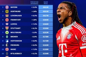 1、拜仁慕尼黑,總身價(jià)9.52億歐元,漲5.0%