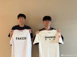 體育資訊7月3日訊 今日MSI淘汰賽上,AL以3:1的比分擊敗FLY,賽后中單選手Shanks更博分享自己與Faker交換隊(duì)服的合照。