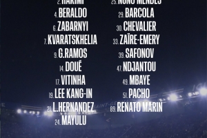 前鋒:7-克瓦拉茨赫利亞、 9-貢薩洛-拉莫斯、14-杜埃、19-李剛?cè)省?9-巴爾科拉、47-恩賈恩圖、49-姆巴耶
