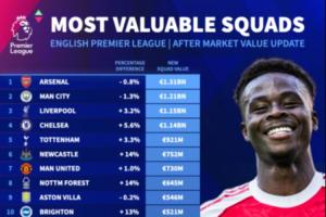 最新英超俱樂(lè)部球員身價(jià)排名(單位:歐元):