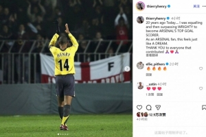 亨利配文寫道:“20年前的今天,我先是追平,此后超越了賴特,成為阿森納隊(duì)史第一射手。作為一名槍手球迷,這感覺就像做夢。感謝大家的付出?!?/p>