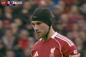 比賽剛開(kāi)始姆伯莫破門(mén),在進(jìn)球前的爭(zhēng)頂,范迪克爭(zhēng)頂中肘擊麥卡利斯特。之后麥卡接受治療,頭上戴上了帽子繼續(xù)比賽。