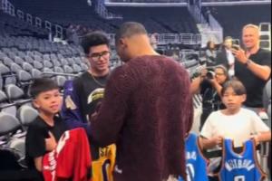體育資訊10月20日訊 美媒昨日曬出視頻,威少為小球迷們簽名,簽了雷霆與火箭的,唯獨(dú)略過(guò)了湖人的。