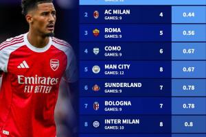 1-阿森納(12場丟3球,場均0.25)