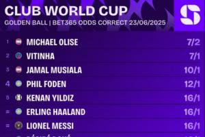 體育資訊06月23日訊 Squawka更新了世俱杯金球獎(jiǎng)賠率榜單,在榜單中奧利塞居首,維蒂尼亞、穆夏拉分列二、三。