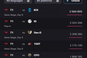 體育資訊10月25日訊 S15海外直播收視率更新,今天T1vsMKOI的瑞士輪出線生死戰(zhàn)熱度來(lái)到第一,超越T1vsiG的入圍賽Bo5。